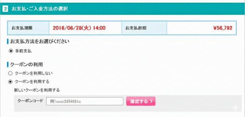 - 予約情報入力画面で「クーポンコード入力欄」を探す