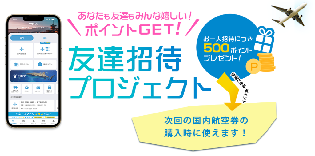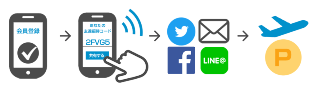 - 友達がこのコードを使って国内航空券を購入~搭乗すると、あなたにポイントが付与される。