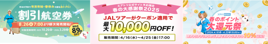 エアトリが提供する割引の機会は大きく分けて以下の2つ。