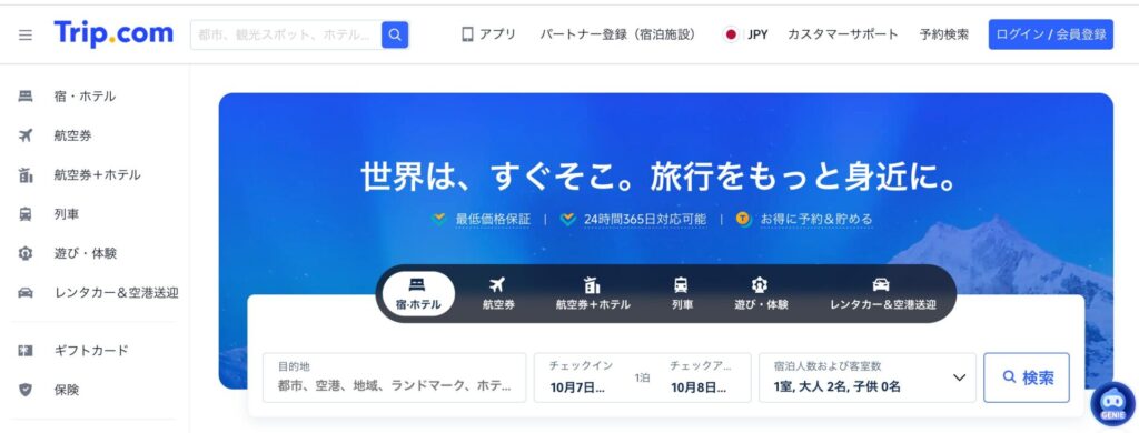 Trip.com | 0.2% | 0円 | 7:00~21:00 | 検索充実、圧倒的な安さが魅力 |