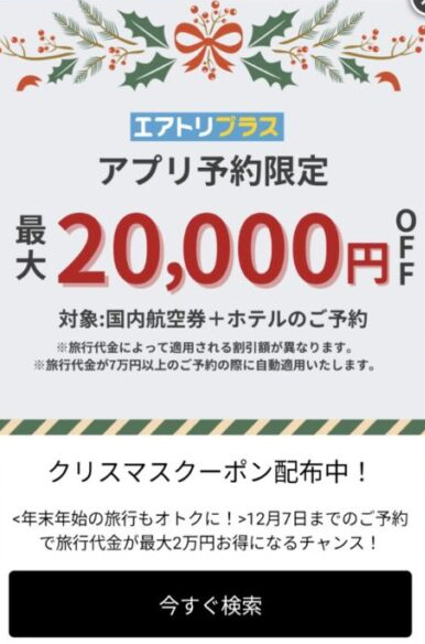 エアトリはブラウザ版よりも「アプリ版」の方が、手数料を相殺できる高額クーポンを配布している傾向があります。まずはアプリをダウンロードしてから予約を進めましょう。