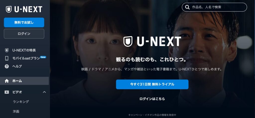 | U-NEXT | 2,189円 | 約6,500本 | 31日間 | 雑誌・漫画も。1,200pt付与 |