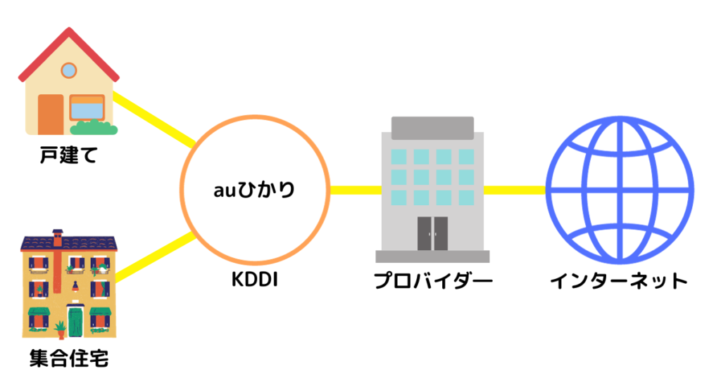 まず一番大事なポイントです。auひかりは、回線(光ファイバー)をKDDIが提供し、プロバイダ(ネット接続事業者)は8社から選ぶ仕組みです。