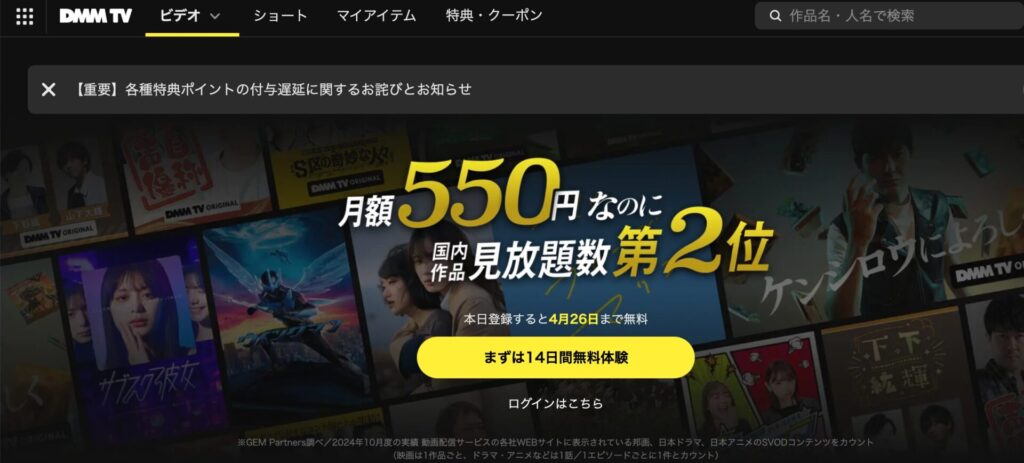 DMM TVの月額料金にポイントを充てる場合、「自分でチャージしたポイント」のみが有効です。キャンペーン等でもらった無料ポイントは月額料金には使えません。