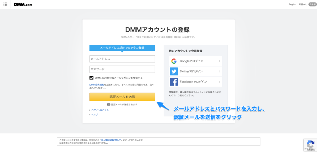 - DMMアカウント作成: 既存のDMMアカウント(ゲーム等)があれば即ログイン可能。