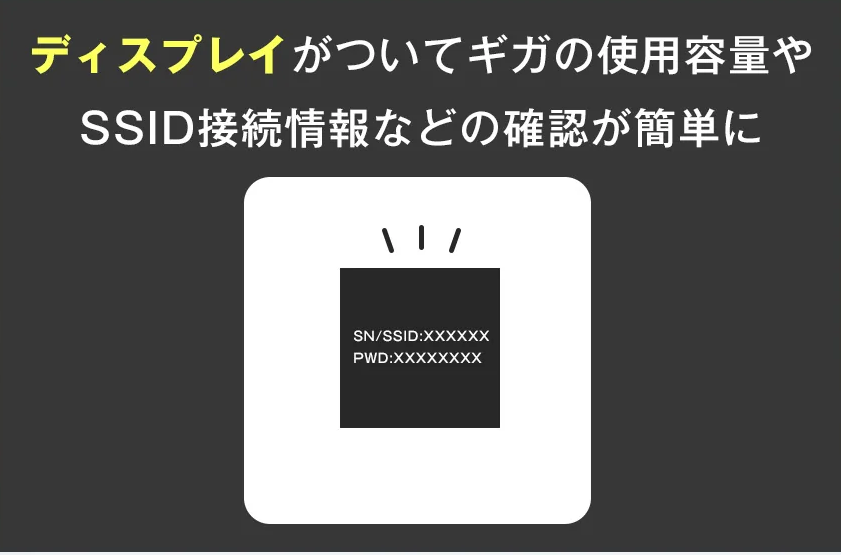ギガ残量や接続中のSSIDなど、必要な情報が本体ディスプレイでサッと確認できます。スマホアプリを開く手間が省け、直感的に操作できるのは大きなメリット。