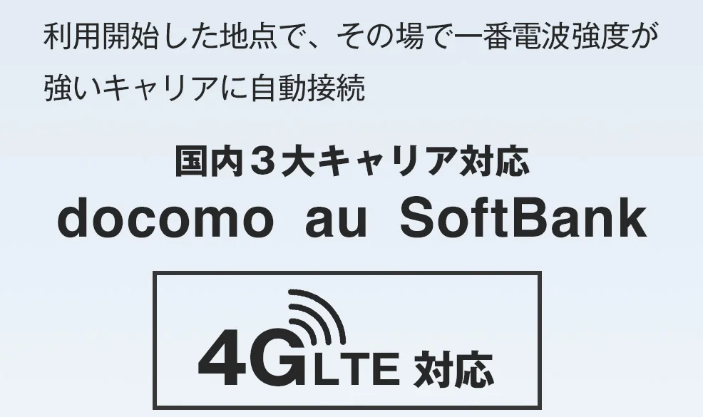 - 3キャリア自動切替!:ドコモ、au、ソフトバンクの回線を自動で切り替えるので、場所を選ばず繋がりやすいのが最大の魅力。