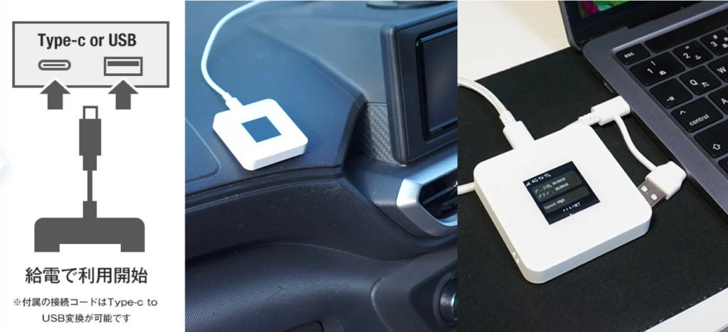 パソコンのUSBポート、車のUSB電源、モバイルバッテリーなど、身近なType-C電源から直接給電が可能です。