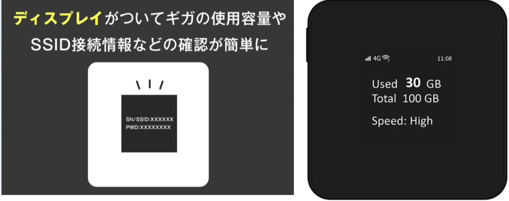 本体に搭載された小型ディスプレイには、Wi-Fiのギガ使用容量、SSID、パスワードなどの接続情報がリアルタイムで表示されます。