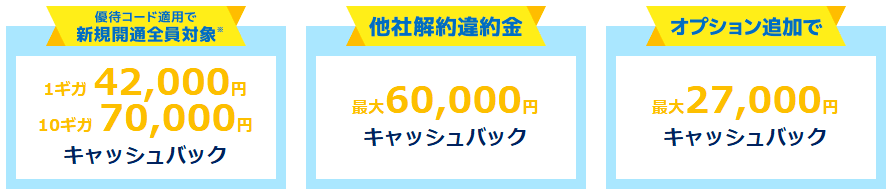 • 全員対象: 最大42,000円キャッシュバック(10ギガなら最大70,000円