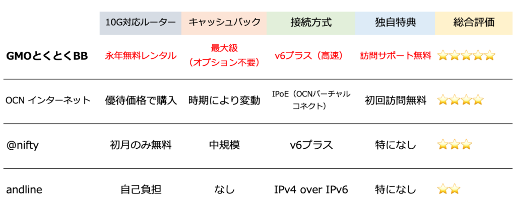 - GMOとくとくBB: 月額190円で、高性能な10Gルーター(市価約2万円相当)がで借りられます。