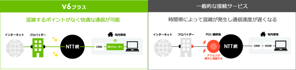 GMOとくとくBBは、混雑を避けて通信できる「v6プラス」を採用しています。夜間でも速度が落ちにくく、動画視聴やオンラインゲームもストレスフリーです。