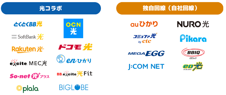 • 独自回線(auひかり、NURO光、eo光など)自社独自の設備を使うため、利用者が限定され混雑しにくく、通信速度が非常に速いのが特徴。高額キャッシュバックも魅力ですが、提供エリアが限られる点に注意が必要です。