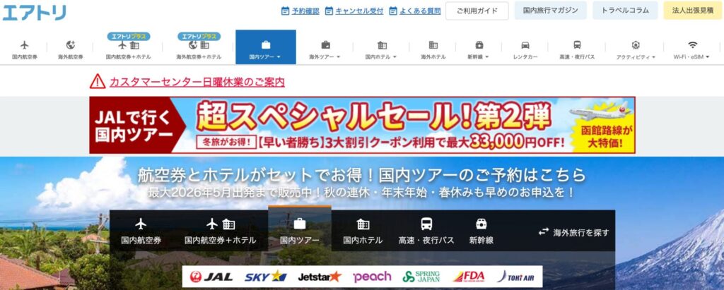 一番の特徴は、ホテルと航空券をセットで予約するとお得になるプランが豊富に揃っていること!「航空券+ホテル」のダイナミックパッケージは、個別に予約するよりも断然安くなることが多いから、宿泊先も一緒に探しているならぜひチェックしてみて。沖縄や北海道など、人気観光地のツアーも充実しているよ。