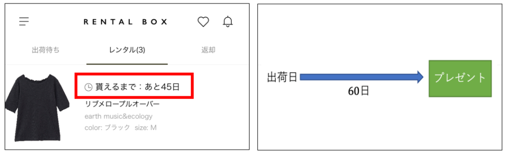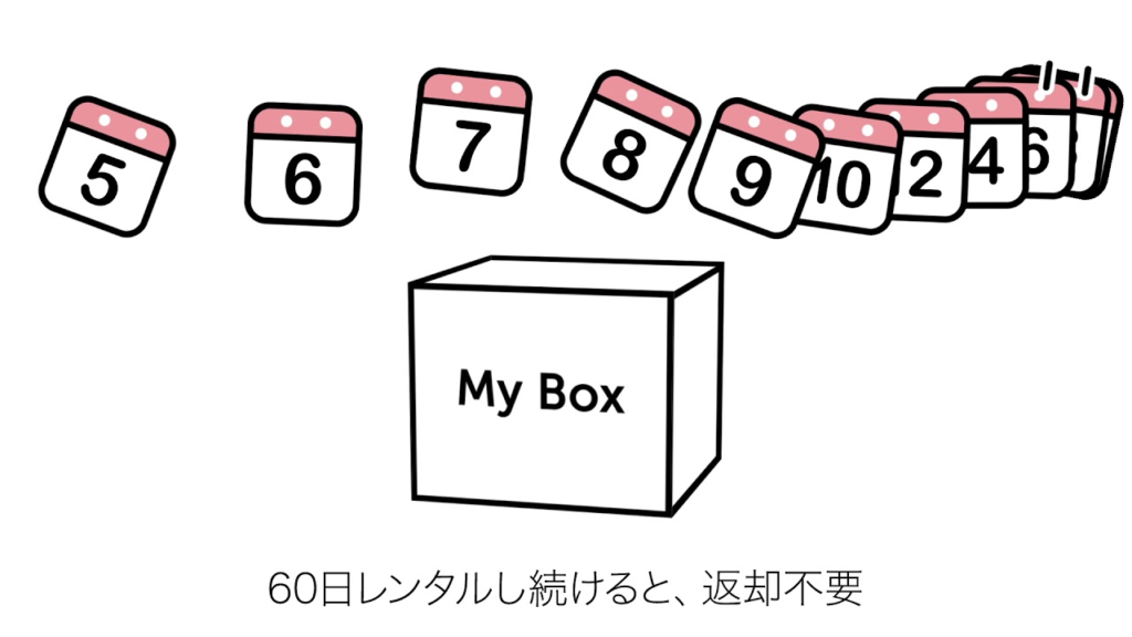 メチャカリの「60日プレゼント」は、同じアイテムを出荷完了から累計60日間借り続けると、そのアイテムが追加料金なしで自分のものになる画期的な制度です。