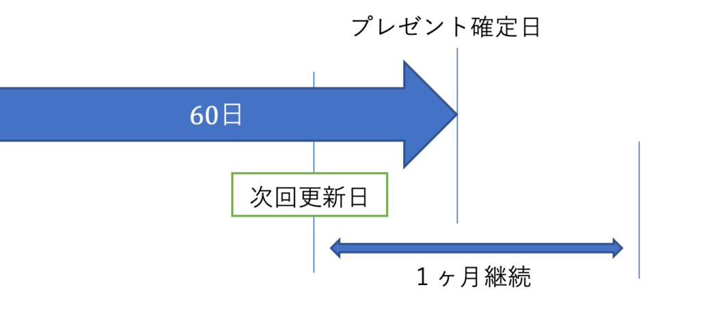 プレゼント確定日が次回の月額料金更新日を過ぎる場合もう1ヶ月分継続する必要があります。「あと3日で60日なのに更新日が来てしまった」という場合は、1ヶ月分払ってでももらう価値があるか計算しましょう。
