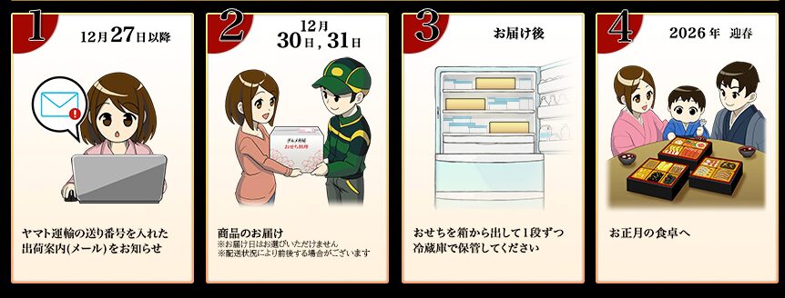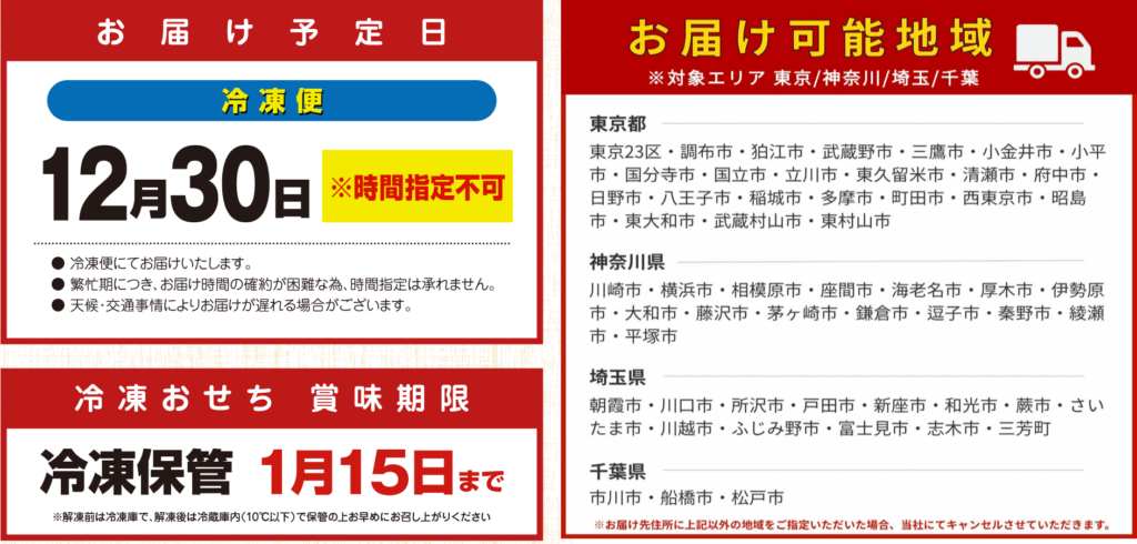 • 冷蔵おせちの場合の配送可能エリア: 冷蔵品はクール便で送られますが、一部地域は配送不可の場合があります。