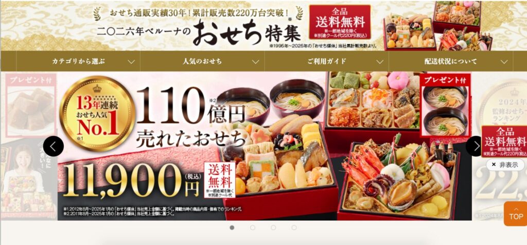 • 特徴: 通販大手として30年の実績を誇り、累計220万台以上の販売数を誇ります。和風、洋風、料亭監修などバリエーションが非常に豊富で、人数、価格、ジャンルから選びやすい冷凍おせちが揃っています。