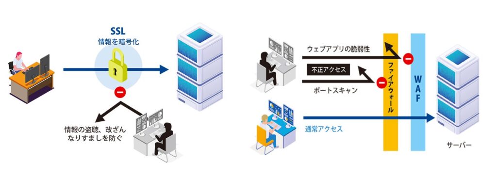 「無料SSL(サイトの暗号化)」や「WAF(不正アクセス防止)」が標準装備されているものを選びましょう。