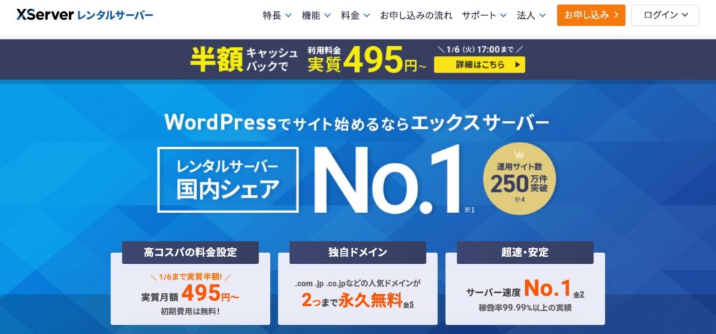 - 国内シェアNo.1の絶対的な安定感:エックスサーバー