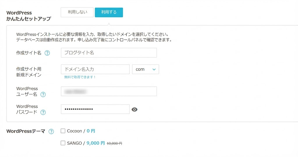| WordPress かんたんセットアップ | 「利用する」を選択します。 |