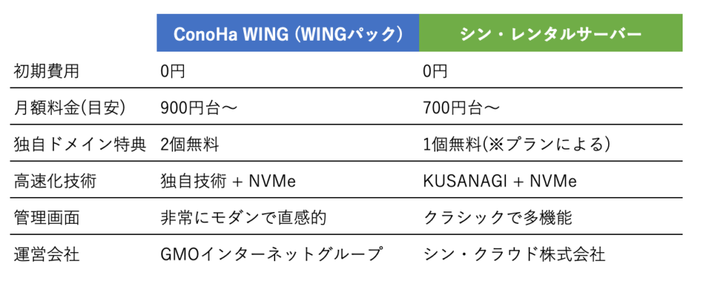 ConoHa WINGとシン・レンタルサーバーを一覧比較
