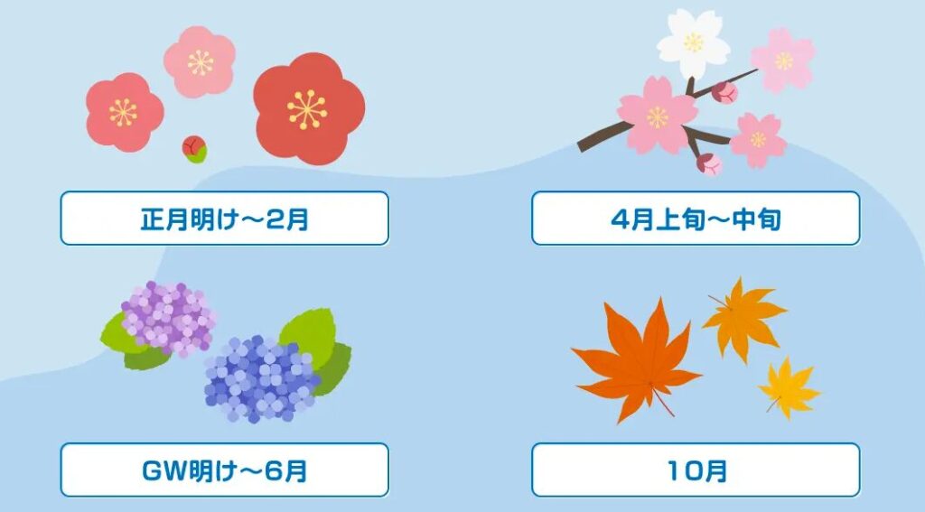 - シーズン: ゴールデンウィーク、お盆、年末年始などの繁忙期は高騰します。旅行時期をずらせる場合は、繁忙期を避けるのが賢明です。
