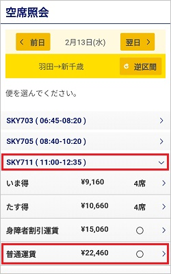 公式サイトの新規予約ページで「空席照会」を行い、「選択便情報」を開いてみてください。