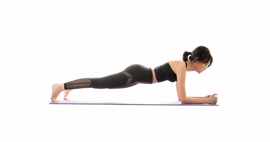 1. うつ伏せになり、両肘を肩の真下について体を持ち上げます。つま先から頭まで一直線になるように意識し、お腹を引き締めます。