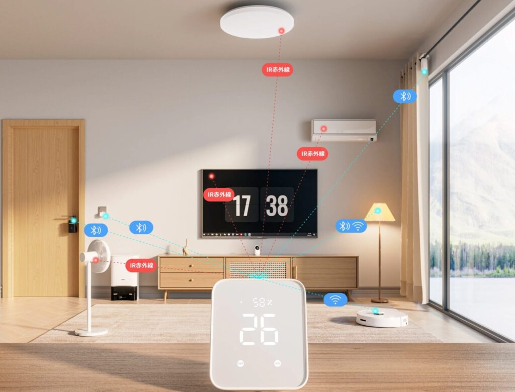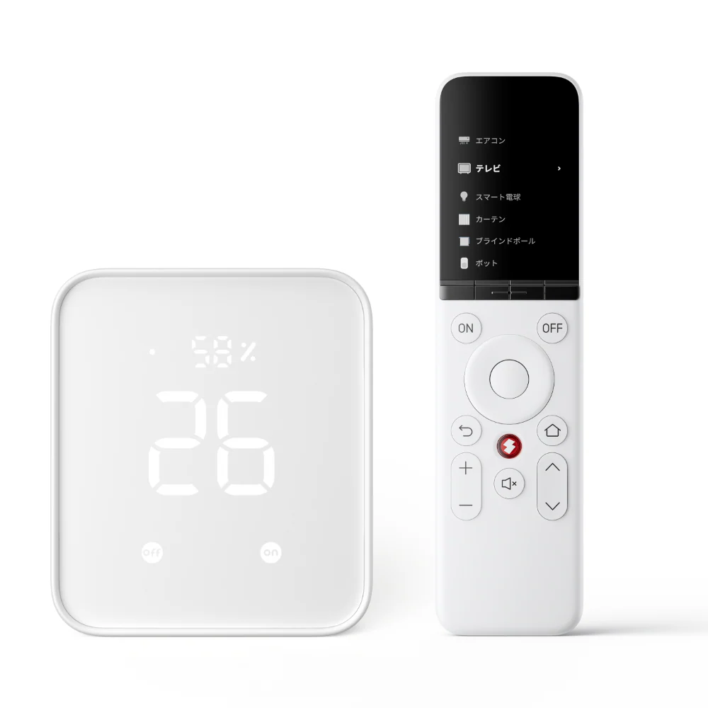 スマートリモコン: エアコンやテレビ、照明など、赤外線リモコンで操作する家電を一括管理できます。スマートフォンアプリから操作できるので、たくさんのリモコンを探す手間も省けます。