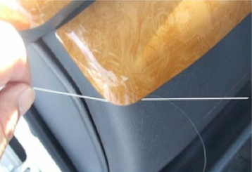 ドアと本体の隙間に釣り糸や細い紐を入れて、のこぎりのように引くとスッと取れます。