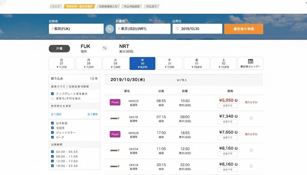 - 検索性: 「カレンダー形式」の最安値表示が見やすく、どの日が安いか一目でわかる。