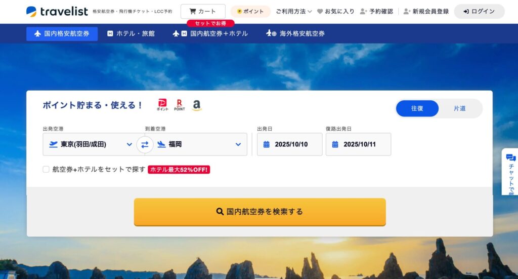 Travelistは、国内外の様々な航空券を比較・予約できるオンライン旅行予約サイトです。JALやANAといった大手航空会社から、ピーチやジェットスターなどのLCC(格安航空会社)まで、幅広い選択肢の中からあなたの旅にぴったりのフライトを見つけられます。