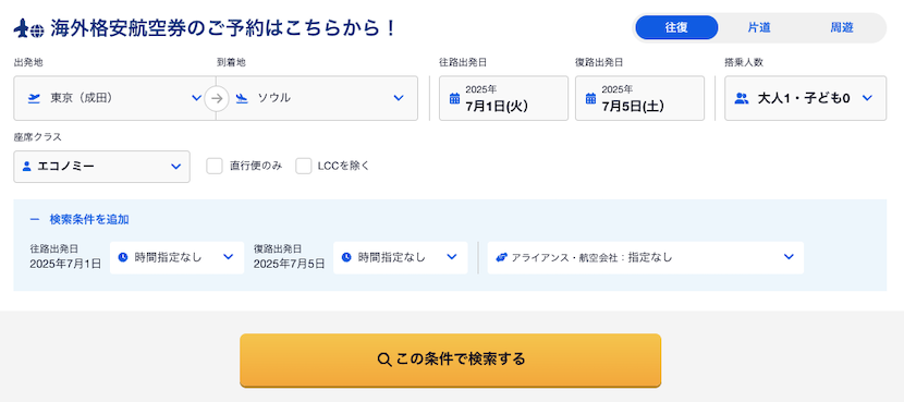 座席クラス(エコノミー、ビジネスなど)の指定や、LCC利用時の受託手荷物の有無もこの段階で指定できます。事前に手荷物の大きさを確認しておくとスムーズです。