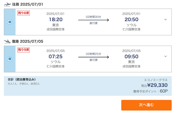 ここで、航空会社、料金、時間帯などを比較し、希望の便を選択します。