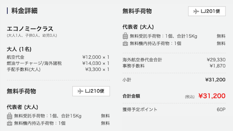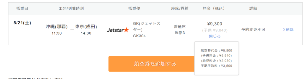選択した便の最終フライト詳細と料金内訳が表示されます。