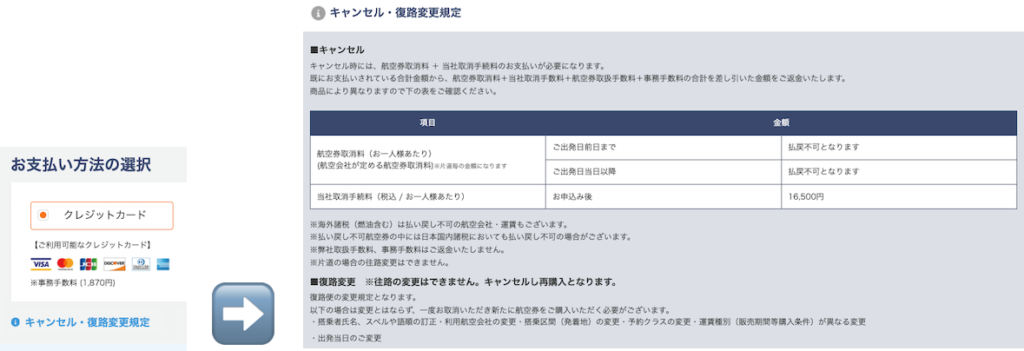 このステップで最も重要なのが、キャンセル・変更規定の確認です。Travelistでは、「クリックしないと表示されない」仕様になっていますが、必ず内容を確認し、納得した上で次に進んでください