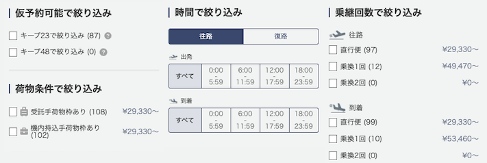 左側のフィルターメニューを使えば、直行便・乗継、価格帯、航空会社などで絞り込みが可能です。「やっぱり直行便がいいな」「この時間帯がいい」といった希望がある時に活用しましょう。